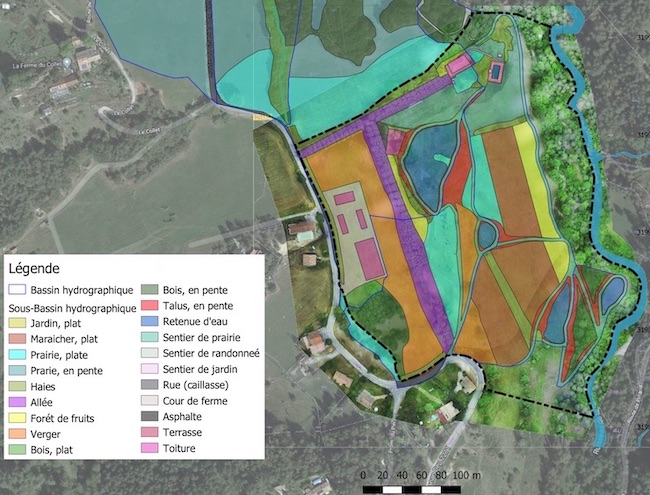 Fig. 2. Le design permacole de la Plume. Repérer les 4 étangs en bleu.