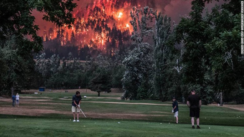 La photo-symbole de la préoccupation pour le climat: Etats-Uniens continuant à golfer devant les incendies majeurs de septembre 2017 à Beacon Rock Golf Course dans l’état de Washington. Il y en a quand même deux au fond à gauche qui regardent le désastre, mais il n’ont pas encore assez de présence d’esprit pour aller voir s’ils peuvent être utile à quelque chose.