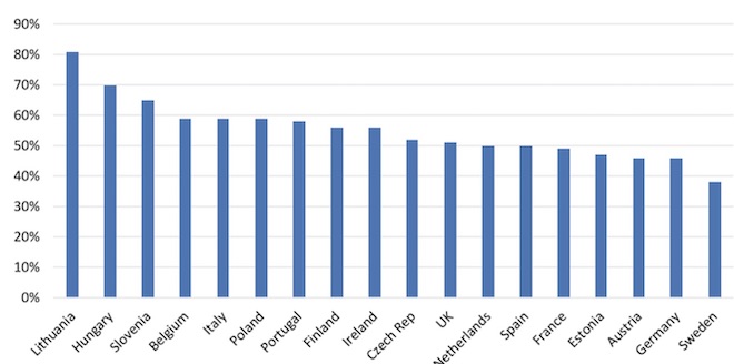 Pourcentage de la population favorable ou fortement favorable à l’existence d’un régime du revenu de base dans son pays en 2016. Shanahan, Smith and Srinivasan (2020)