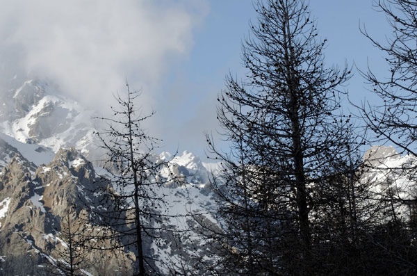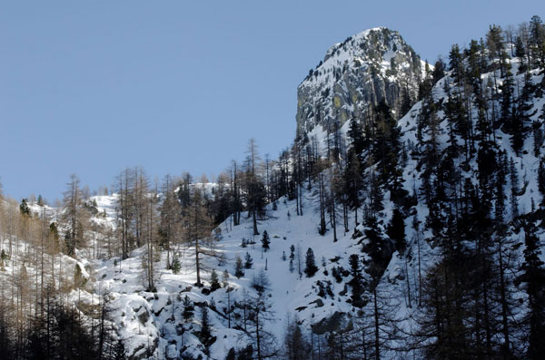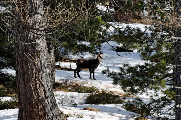 Cette forêt abrupte était bien peuplée. Je m’étonne d’ailleurs d’avoir découvert, moi dont la vue n’est pas excellente, autant de chamois, si difficiles à distinguer dans le fouillis des branches. Je regardais plutôt à mes pieds, car le chemin était très pénible : pierres glissantes, mince couche d’aiguilles qui cachaient de la glace vive, longues traversées de glace, pas du tout traitresse car bien apparentes mais peu adhérentes aux semelles de mes chaussures. Je me retrouvais souvent à 4 pattes, pour contourner des passages dont je me demandais, avec un peu d’inquiétude, comment je les franchirai à la descente.