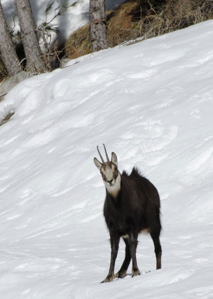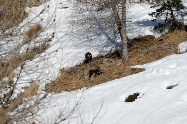 D’habitude, quand un chamois se sent menacé, il s’éloigne plus ou moins rapidement et se remet à brouter, dès que l’intrus est au-delà de sa distance de fuite. Il m’était déjà arrivé d’observer des comportements plus belliqueux : lors d’un bivouac en juin dernier, juste au dessus de l’endroit où je me trouvais ce jour-ci de janvier 2011, un mâle avait fait les 100 pas à la nuit tombante, au dessus de ma tente, en poussant son cri à chaque fois qu’il se retournait pour repartir en sens inverse. C’est d’ailleurs, cette fois-là, que j’avais identifié ce cri en apercevant ses lèvres bouger au rythme du signal. Il n’appréciait pas du tout que je veuille passer la nuit sur ses terres et tenait à me le faire savoir.