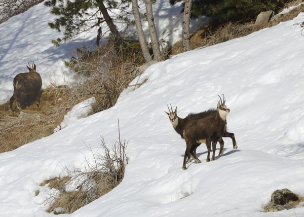 A cette époque, il n’y a naturellement personne sur cette étendue enneigée. Ma déception est de courte durée. Le temps de chausser les raquettes, pour aborder les 1ères pentes, et je découvre plusieurs petits groupes en train de brouter, sans se soucier le moins du monde de mon intrusion dans leur domaine. J’ai souvent remarqué qu’en terrain découvert, lorsqu’ils nous voient de loin, les chamois ne se laissent pas approcher. En revanche, quand, caché par le terrain, on surgit plus près, ils tolèrent une distance beaucoup plus courte. Tout se passe comme si c’est moins la distance en valeur absolue qui les effraie que le fait qu’on la réduise en se rapprochant.