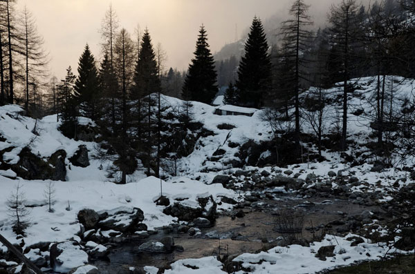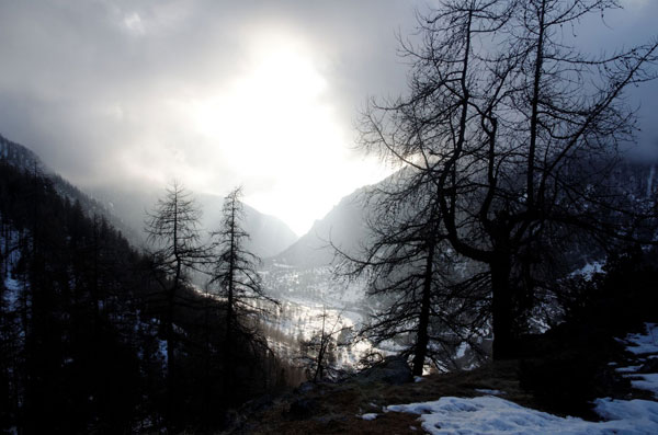 La descente, je l’ai déjà dit, s’est bien passée grâce aux raquettes utilisées comme des crampons. Le soleil a quitté mon petit vallon depuis un moment, mais le fond de la vallée est encore illuminé.