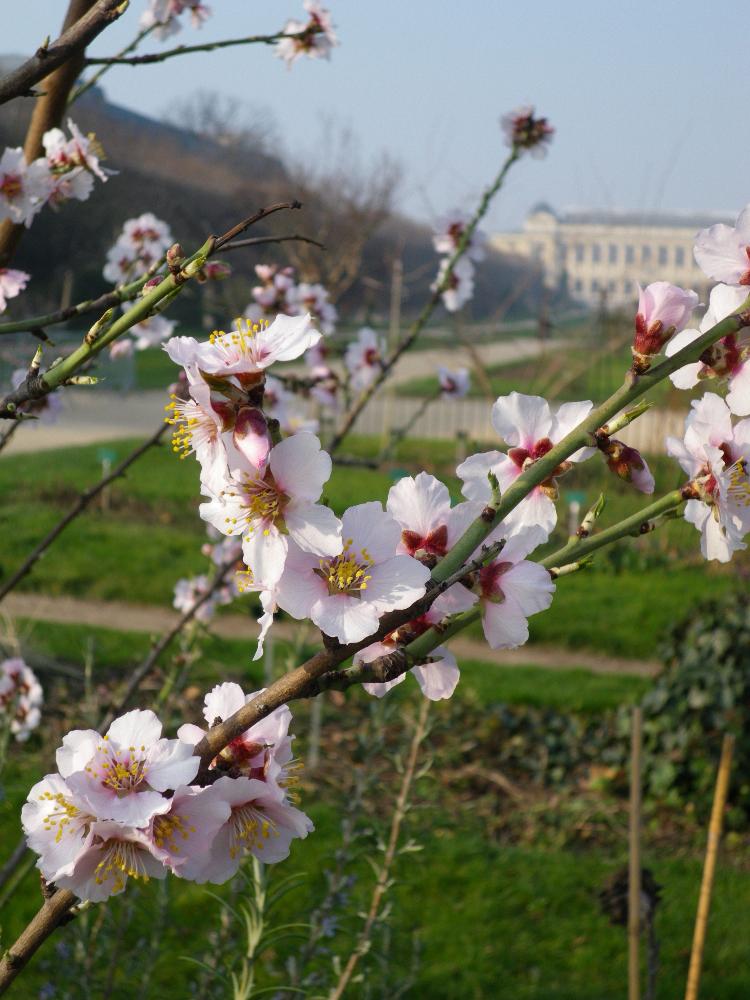 En entrant dans le Jardin des Plantes par le numéro 10 de la rue Buffon, un cerisier d’hiver florissant, aux tons rosés, vous accueille et vous salue joyeusement. Quelques pas de plus et c’est un cerisier de l’Oregon, tout blanc, éclatant, qui vous invite à prolonger la balade. Ce blanc est une fête, une célébration.