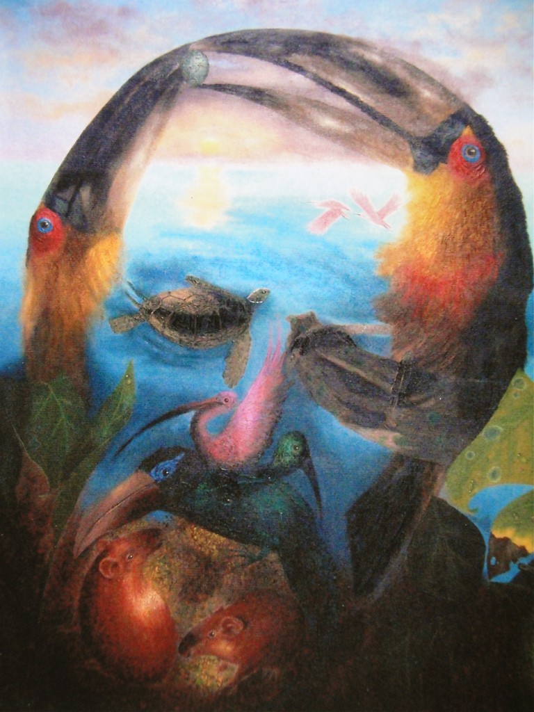 Ce portrait de Teddy Godsmith est un hommage qui lui a été rendu par le peintre Martin Jordan en 1999. Il l’a intitulé « Illusory portrait » dans le style du XVI ème siècle à la manière de Giuseppe Arcimboldo. Il est composé d’oiseaux , de lézards, de tortues, d’agoutis, de mer et de ciel…