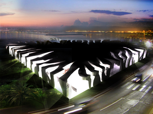 Menton 2012. Entre la mer et la vieille ville se dresse depuis deux mois un grand triangle de ciment moulé blanc de 4,50 mètres de hauteur, reposant sur des colonnes irrégulières évoquant, selon l’imagination du promeneur, des flammes ou des dents.