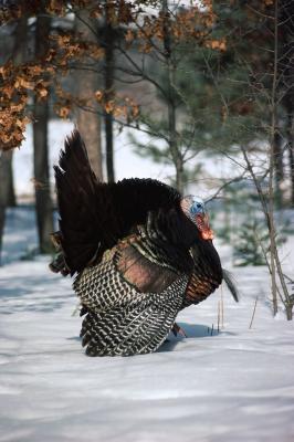 At night, after their long day’s hike searching food, turkeys take to trees where they can roost and rest safe from prowlers. At daylight they descend to resume their endless march. When the ground is covered with snow, they might remain at roost for days and may choose nut trees like oaks (Querus) for food.
