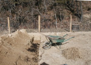Il me faut planter des arbres avant de m’occuper des plantes annuelles. Les arbres mettront du temps à pousser et j’aimerais qu’ils portent leurs fruits de mon vivant.  Pour planter des arbres, il faut faire des trous, assez grands.