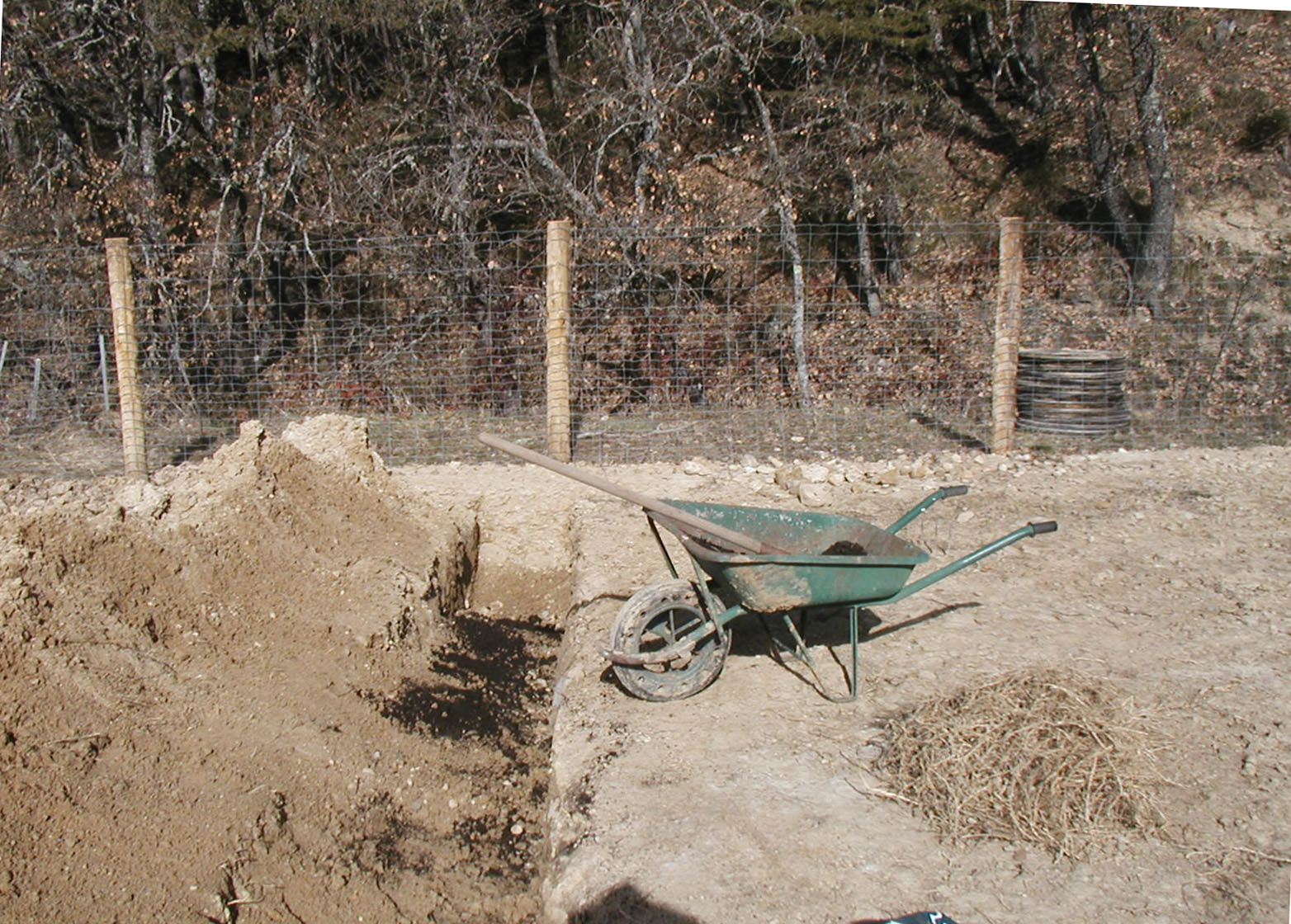 Fig. 1. Une tranchée destinée à recevoir des noisetiers, en cours de remplissage, sur la droite à côté de la brouette, un tas de racines de chiendent.