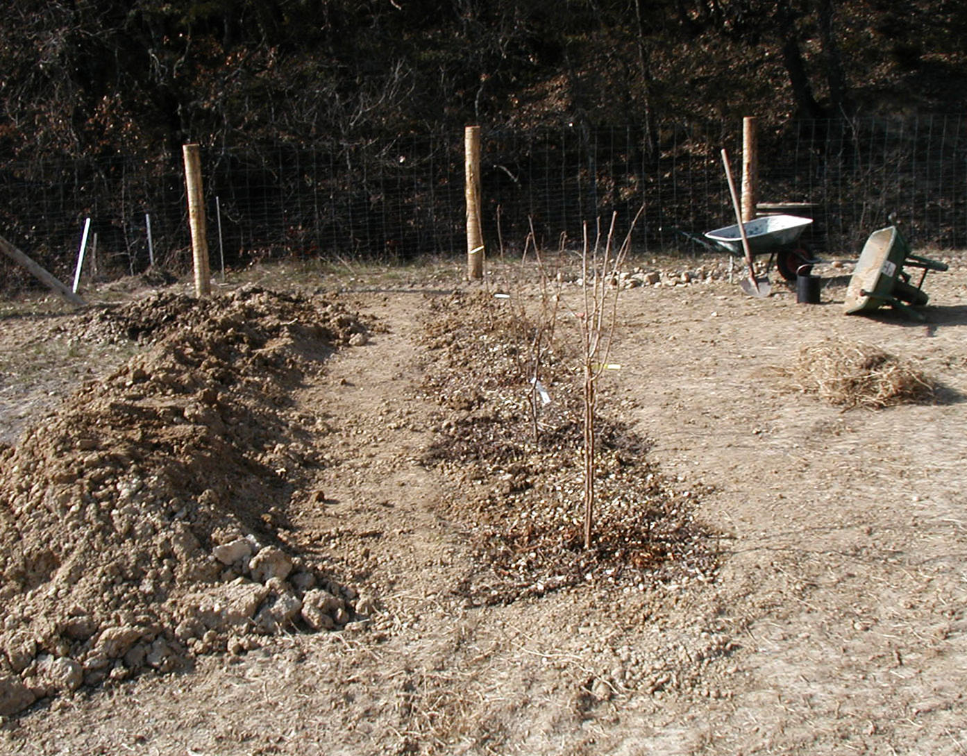 Fig. 2. Les noisetiers en place. La terre en excès sur le côté résulte pour partie de l’apport de compost mais surtout du fait que dans la tranchée elle est moins compacte qu’avant le creusement.