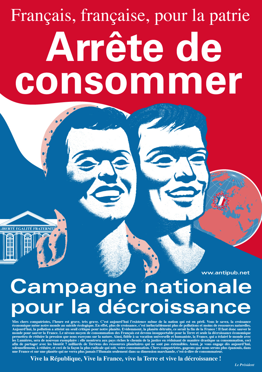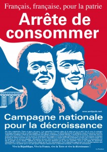 Le débat se poursuit sur les listes de discussion et dans les réunions des écologistes, encartés ou non, sur l’utilisation jugée souvent trop démobilisatrice du mot “décroissance”. On peut ajouter que, le moins qu’on puisse dire, c’est que ce mot ne figure pas dans le discours du gouvernement en place, pas plus que dans celui du précédent (affiche empruntée aux casseurs de pub).