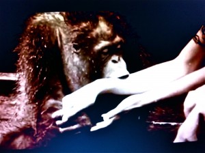 La blancheur nue d’un bras qu’on devine de femme et qui se tend vers la paluche grossière aux doigts noueux et crochus d’un chimpanzé. La main et la patte se cherchent, se trouvent, s’entrelacent, se caressent avec une douceur, un respect infinis. Pas de hâte, nulle intention cachée. Juste deux êtres à la fois proches et pourtant si différents qui cherchent à se rencontrer et à se connaître, en silence. La main ne suffit pas, il faut la goûter pour mieux la connaître, cette peau glabre si blanche, lisse, différente. La langue paisible de l’animal remonte le long du bras, pas vorace, non, juste attentive, à l’écoute.