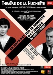 La pièce de Mario Diament, fiction basée sur des faits réels nourris de la correspondance des deux personnages, relate à travers leurs rencontres l’évolution de leurs relations, scandées par la montée du nazisme. Hannah , juive, s’exile pour fuir les persécutions. Martin, lui, séduit par la nouvelle idéologie, bien qu’il s’en défende, flirte ouvertement avec le pouvoir hitlérien, pour préserver son statut social et familial. Au fond de la scène, sur un écran, une discussion entre intellectuels rappelle opportunément à la mémoire déficiente du spectateur les personnalités exactes des deux philosophes.