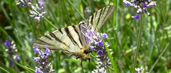 C’est l’hôte de deux papillons en voie de disparition le flambé (Iphiclides podalirius- Fig. ci-dessus) et le gazé (Aporia crataegi) si l’on en croit Wikipedia, ainsi que le bronzé Strymonidia (1). En tous cas les flambés sont fréquents en juillet à butiner notre bordure de lavande. Le prunellier se propage en émettant de longues racines traçantes qui j’espère profiteront de la tranchée pour aller là où je le souhaite. Pour le moment, sur trois plants, il n’y en a qu’un qui ait vraiment repris et il lui a fallu deux ans pour cela.