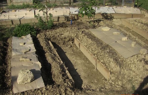 J’ai gardé les plus petites à la cave comme semence et je recommence l’essai l’année suivante, bien plus tôt et avec un accessoire supplémentaire : j’achète une plaque de polycarbonate (plastique transparent) pour faire chassis. Le démarrage en avril est bien plus rapide que pour leurs semblables mises de manière classique en pleine terre. Je remplis progressivement le coffrage avec un mélange d’argile pulvérulente, de sable fin et de compost, que je suppose à la fois léger et fertile.