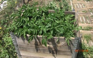 Fig. 1. Culture des pommes de terre en hauteur, fin mai 2011, le haut du coffrage en bois est à 60 cm du sol.