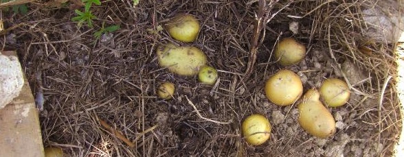 La récolte cette fois est de 2,9 kg, ce qui me donne un rendement voisin de 75 tonnes à l’hectare. La formation de tubercules le long des tiges enterrées n’a pas marché mais le fort rendement me console. Après discussion avec mes voisins permaculteurs de la Ferme du Collet, on pourrait expliquer ce résultat inattendu de la façon suivante : les racines des pommes de terre ont besoin d’humidité, j’ai mis trop de sable, le mélange était trop drainant et n’a pas favorisé la ramification des racines ni la formation de tubercules. Par contre, le compost entrainé par la pluie ou l’arrosage s’est accumulé au fond, au contact de l’argile compacte, où les conditions d’humidité et d’une nourriture abondante étaient réunies, ce qui explique le rendement exceptionnel. J’essayerai l’an prochain de remplir les hausses en omettant le sable et me contentant de la terre argileuse bien lourde qui constitue le substrat premier de notre jardin.