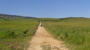 J’ai aperçu au loin 2 parcs de 6 éoliennes et hélas, 3 énormes arroseuses. Ironie de la situation, nous sommes sous la pluie et dans des chemins gorgés d’eau. Quelle vanité de l’homme de vouloir faire pousser des plantes non adaptées à l’écosystème grâce à la technique et au mépris des ressources locales. J’ai vu un premier champ d’orge et toujours aussi peu d’animaux excepté quelques oiseaux et un troupeau de moutons fraichement tondus.