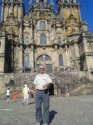 L’arrivée dans la ville est conforme à ce que l’on m’avait raconté, priorité aux voitures. Par contre il y a moins de boutiques pour touristes que ce que j’avais imaginé. Sur la place principale où j’arrive avec Lutgarde, que j’ai retrouvée à l’entrée de la ville, Hugo et Sarah nous accueillent avec une banderole confectionnée par leur soins : « Congratulations you’ve made it ! ». Les touristes grouillent et nous devons aller au plus vite dans la cathédrale pour être sûr d’avoir des places assises, car l’accès réservé aux pèlerins est fermé pour cause de travaux. A l’issue de la messe des pèlerins, concélébrée par l’évêque et une dizaine de prêtres dont plusieurs accompagnent des groupes, nous avons droit au « Botafumeiro ». La cathédrale est encore plus rococo et surchargée de dorures que les églises précédentes. Il est perceptible que tout ce rituel est bien huilé, mais l’émotion de l’arrivée est néanmoins présente en moi et sur le visage des pèlerins que je connais.