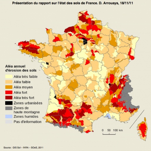 Et pourtant nous dégradons ce patrimoine à grande vitesse. Une partie des sols s’érode et finit sa course dans les rivières et les océans. La faute principalement à l’agriculture intensive qui laboure et laisse les sols nus et donc sans défense une bonne partie de l’année. Et qui a détruit les haies et prairies qui limitaient le ruissellement des eaux. La FAO (Organisation des Nations Unies pour l’alimentation et l’agriculture) estime que cette seule érosion frappe 24 milliards de tonnes de sols par an, soit 3,4 tonnes par être humain. Enorme. En France, la situation est inquiétante notamment en région parisienne mais aussi dans une partie de la Bretagne et de la Picardie (voir carte ci-dessous réalisée dans le cadre du projet GISSOL).
