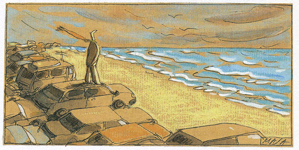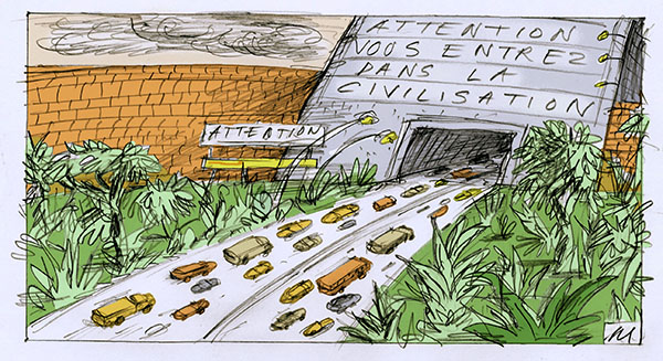 Les voitures accaparent la plus grande part de l’oxygène pour nourrir leurs explosions. Elle chargent l’air ambiant de divers sous produits fossiles. Elles en barbouillent en noir les poumons et les façades sans jamais payer les frais des cancers, ni du décrassage des immeubles. Les voitures les plus riches comportent jusqu’à quatre orifices d’échappement. (Ou trous du cul chromés.) Elles règnent bruyamment de jour et de nuit sur le silence naturel . Elles refusent systématiquement la priorité piéton sur les passages qui leur sont théoriquement réservés.