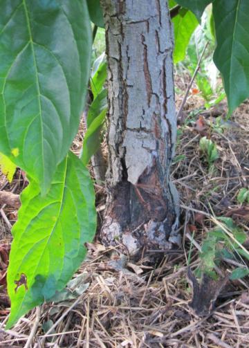 Fig. 2. L’écorce du tronc de ce plaqueminier s’est craquelée lorsque, plus jeune, il était exposé aux rayons du soleil. Le bourrelet cicatriciel n’a pas encore
