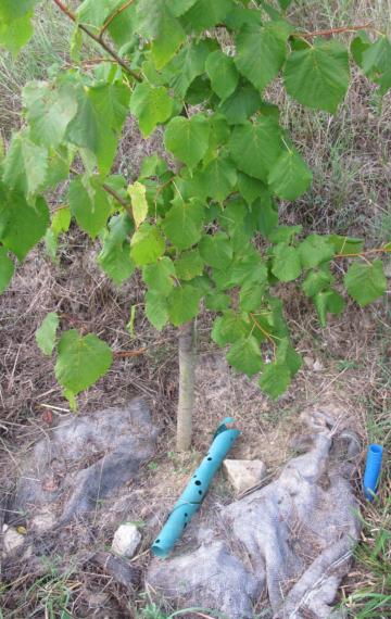 Fig. 4. Tilleul à grandes feuilles. La bande en plastique souple perforé qui protégeait le tronc a été retirée pour la photo. Sur la droite le tuyau de plastique bleu qui sort du sol a été installé au moment de la plantation, pour un arrosage profond. A 1 m de profondeur, il débouche sur une petite poche de sable. On évite ainsi que le développement des racines ne se fasse en surface, ce qui les rendrait plus vulnérables aux épisodes de sécheresse.