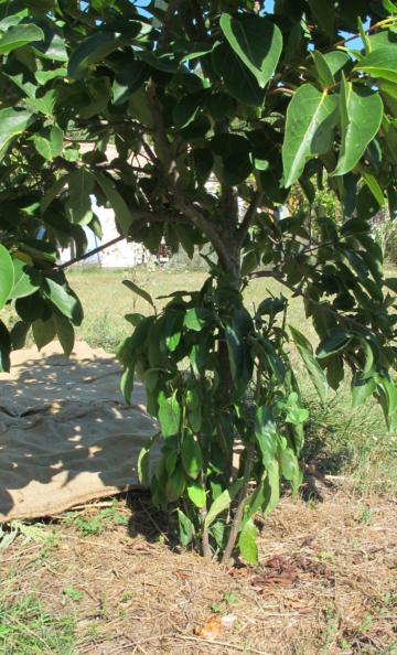 Je continue à couper les gourmands qui partent de la base, mais seulement en hauteur, lorsqu’ils rentrent dans la zone où le tronc se ramifie et où les branches feuillues procurent toute l’ombre et la photosynthèse nécessaires (voir Fig. 3). Je crois qu’il est possible de profiter de leur vigueur, sans pour autant affaiblir le greffon. De toutes façons, quelle que soit la taille, c’est toujours délicat de tailler.