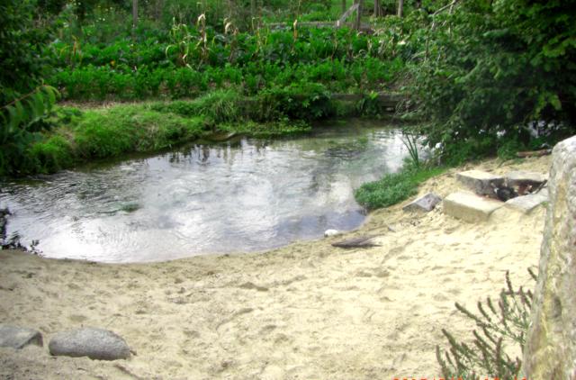Fig. 5. Un camion a apporté le sable nécessaire pour une petite plage au bord du ruisseau à truites (il y a des enfants à la ferme). On peut voir les rangées de légumes à l’arrière plan.