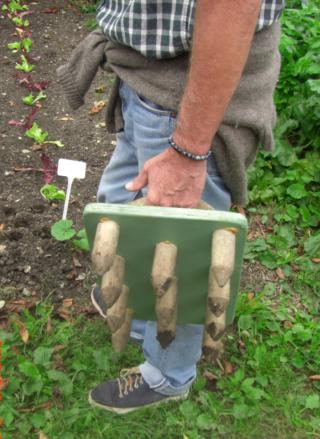 La culture manuelle ne se fait pas seulement à mains nues. Charles nous montre avec fierté ses instruments, certains classiques mais d’excellente qualité, binette autrichienne en bronze, sécateur japonais, d’autres qu’on ne trouve pas du tout ailleurs, plusieurs outils anciens dont on a perdu l’usage, le semoir d’Eliot Coleman d’origine américaine, mais aussi une création, la Campagnole, dont ils assurent la vente (Fig. 6), ou des plantoirs à trous multiples que chacun peut bricoler chez soi (Fig. 7). La Campagnole est un outil ergonomique adapté à ameublir un sol déjà bien aggradé et semble effectivement bien supérieure au motoculteur pour cet usage. Les outils sont l’un des sujets de recherche de la ferme du Bec Hellouin Vous pouvez télécharger sur leur site tous les détails sur ce sujet.