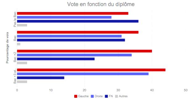 Enfin un graphique reproduit dans l’article de l’Obs suggère que pour ne pas voter FN, il faut avoir fait des études !
