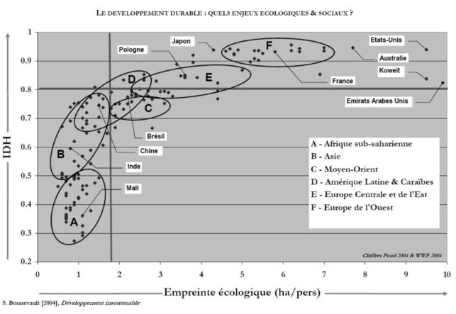Qu’est-ce que ces chiffres nous apprennent ? D’après les médias, beaucoup. Ils seraient la preuve que l’humanité vit au-dessus de ses moyens, en particulier les pays riches, les États-Unis surtout, nouvelle illustration de l’inégalité de la répartition des richesses dans le monde : une minorité bouffe tandis que la majorité la regarde, ceci expliquant cela. Ces chiffres, à lire les commentaires, nous montrent l’étendue des efforts que nous avons à faire, nous riches, pour réduire notre empreinte, et que les pauvres ont dans le même temps à poursuivre pour améliorer leur niveau de vie sans trop creuser leur empreinte. Du reste, en croisant tous ces résultats avec ceux de l’IDH (Indice de développement humain), on obtient une belle courbe en crosse de hockey particulièrement révélatrice : l’augmentation du bien-être passe immanquablement par celle de l’empreinte écologique, exponentielle au-dessus d’un IDH de 0,9. Le secteur vertueux borné, sur le graphique, par l’IDH idéal de 0,8 et l’empreinte à ne pas dépasser de 1,8 hag ne contient que Cuba. Pour le rejoindre, les efforts semblent incommensurables, d’un côté comme de l’autre.