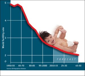 Pour en revenir au point de départ, il est clair que nous ne pouvons procréer sans sexualité mais que la sexualité ne se réduit pas à la procréation. Ce dernier constat est vrai pour les microbes mais c’est vrai aussi pour notre espèce : chez nous le sexe est un outil de lien social, joignant l’utile à l’agréable. La culture patriarcale, les religions du livre, ont mis l’accent sur la procréation, ce qui a fait leur succès génétique. Elle fournissent une réponse à l’incertitude sur la paternité en restreignant la sexualité des femmes, la chasteté des hommes étant de ce point de vue moins importante. Il est aisé de constater le parallèle entre transition démographique et libération des femmes, presque simultanées. La baisse de fertilité mondiale constatée à partir de 1970 (fig.) permet de caresser l’espoir que notre espèce s’affranchisse de la mécanique darwinienne, s’arrête de proliférer à temps pour ne pas détruire complètement l’écosystème qui permet sa survie.