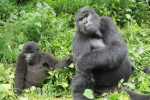 Vous me direz que nous ne sommes pas des oiseaux et vous aurez raison parce que quand le nid est dans le ventre de la maman, le papa ne peut couver l’œuf. En outre nous sommes des animaux sociaux qui vivons en groupe et ont de nombreuses interactions en dehors du couple reproducteur. Chez les Hominoïdes, la famille de grands singes à laquelle nous avons donné notre nom, il y a des monogames : chez certaines espèces de gibbons on ne peut distinguer le mâle de la femelle (fig. à gauche), les couples sont isolés sur leur territoire, ils restent ensemble, parfois des mois sans aucune activité sexuelle. Il y a d’autres grands singes qui ont une stratégie de harem (un mâle pour plusieurs femelles) : les gorilles. Le mâle est deux fois plus gros que la femelle (fig. à droite) et a des canines bien qu’il soit strictement végétarien. Contrairement aux fantasmes évoqués par Brassens, son activité sexuelle est modeste et son pénis cinq fois plus petit que le nôtre. Son énergie virile est consacrée à éliminer physiquement ses concurrents, pas à forniquer. Il y a les chimpanzés, nos plus proches parents, qui vivent dans des groupes multimâles-multifemelles et sont bien plus portés sur le sexe que les gorilles. Une partie de la compétition entre mâles se traduit par la présence de très gros testicules, qui vont noyer sous un flot de spermatozoïdes la semence des concurrents, déjà présente dans le vagin d’une femelle peu farouche.