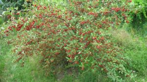 Le goumi, originaire d’Extrême orient, est un arbuste à usages multiples, peu exigeant sur la nature du sol ou le climat : il tolère -25°C l’hiver et résiste bien à la sécheresse l’été. Il est réputé résistant au pourridié (Armillaria mellea)(2). Au printemps les fleurs sont très abondantes comme l’indique le nom d’espèce multiflora, nectarifères et appréciées des abeilles, les fruits (en juin) sont comestibles. J’ai planté successivement deux cultivars sélectionnés pour leurs fruits, Sweet Scarlet en 2009 et Red Gem en 2010. J’ai un doute sur l’étiquetage à la pépinière car je n’ai pas pu déceler de différence entre les deux. Je ne m’étendrai pas sur les qualités de ces fruits, qui évoquent ceux du goji par leur abondance, leur petite taille, leurs vertus supposées et leur médiocrité gastronomique (à mon goût !). Ils sont simplement beaucoup plus précoces en saison. Ils sont tous les ans aussi abondants que sur la figure 1, sauf en 2017 comme je l’ai déjà raconté : les gelées tardives ayant privé les oiseaux de cerises, il mangeaient les baies de goumi dès qu’elles étaient à peine roses. Les fruits peu attrayants en frais apportent cependant leur touche d’acidité et leurs vitamines à des confitures mixtes coings-goumis ou coings-goumis-argouses. Pour cela je les stocke au congélateur ou bien j’en fais un jus que je stérilise par la chaleur dans l’attente de la maturité des coings. La cueillette demande de les saisir et de les faire basculer à angle droit avant de tirer, pour éviter que la queue ne vienne avec. Ils sont rouges avant d’être mûrs et à ce stade ils sont âpres, ils grossissent un peu par la suite et deviennent plus mous, signe de maturité.