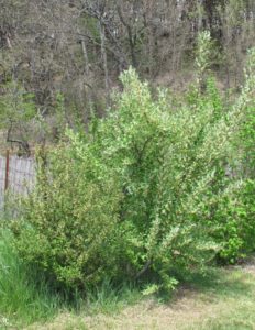 J’avais repéré sur le catalogue de La Feuillade, pour le coût raisonnable de 6 € une “touffette de goumi” sans mention de variété. Cette “touffette” très petite au départ a vite rattrapé et dépassé les deux cultivars déjà mentionnés. D’une vigueur remarquable, j’ai dû lui couper régulièrement des branches pour qu’elle respecte le développement du Sweet Scarlet (buisson de gauche plus sombre sur la figure 2) dont elle était censée favoriser la fructification. Elle se couvre de fleurs en même temps que les autres et je pensais qu’elle ne donnait pas de fruits jusqu’à cette année où je me suis rendu compte qu’ils étaient beaucoup plus tardifs (septembre au lieu de juin), beaucoup plus petits (plutôt 3 mm de diamètre au lieu de 10) et probablement appréciés des oiseaux car ils ne restent pas longtemps sur les branches. Pour rédiger cet article je me suis adressé à nouveau à La Feuillade et nous sommes tombés d’accord sur un nom d’espèce : umbellata (chalef argenté ou autumn olive). Si les oiseaux ne les mangeaient pas, il me faudrait attendre les premiers froids pour que les fruits perdent leur apreté. De tous mes essais de culture à La Penne, cet Elaeagnus umbellata reste la meilleure source abondante de biomasse raméale, ex aequo avec le robinier (Robinia pseudacacia).