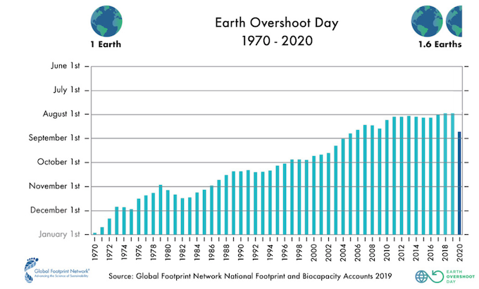 Depuis 2014, le Sauvage vous signale chaque année la date du jour du dépassement des ressources de la planète (http://www.lesauvage.org/2014/08/overshoot/). C’est l’Earth Overshoot Day calculé par le Global Footprint Network, cette institution d’origine universitaire à l’origine de la notion d’empreinte écologique. Cette année le jour du dépassement est le 22 août, plus de 3 semaines plus tard qu’en 2019. Ce n’est pas la première fois que notre empreinte s’allège depuis le début du dépassement en 1970 mais c’est un record. Pour mémoire le dernier recul a été causé par la crise de 2008. Pour cette année la cause est connue, c’est le confinement dû à la pandémie. S’il fallait cette preuve supplémentaire, cela confirme que la gestion de la planète est incompatible avec la croissance économique.