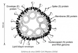 Schéma du virus montrant l’ARN au centre, et l’enveloppe lipidique avec ses protéines