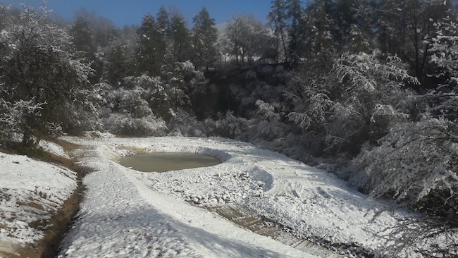 Le défi était le remplissage et le maintien de nappes d’eau permanentes sous le climat contrasté de l’arrière pays niçois. Les études d’ingénierie dont nous parle joyeusement Josef en anglais pendant que nous frissonnons sous un ciel menaçant (qui nous poudrera de neige en fin de visite) ont l’air solides. La documentation basée sur les archives météorologiques remonte à cent ans en arrière. Ils n’ont pas seulement tenu compte de la pluviosité annuelle mais de sa fréquence et son intensité journalière voire horaire, ce qui est judicieux si l’on veut bien se souvenir des épisodes « méditerranéens » récents qui ont frappé les Alpes maritimes. Pour le moment nous sommes au niveau du bassin supérieur (le plus grand sur la figure 2) et le paysage évoque ce que devait être Verdun en 1916. De grands tas de terre plus sombre témoignent du soin mis à préserver la couche superficielle de terre arable (Fig. 3) : elle est retirée des surfaces qui deviendront les étangs ou leurs barrages de retenue.