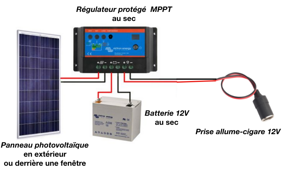 Installation minimale, car il n’y a pas la coûteuse génération de courant 230V. Minimale, parce que l’installation ci-dessus, peut, telle quelle, avec précautions au moment du câblage, et un bon régulateur-chargeur électroniquement protégé sur ses entrées et sorties, se passer d’interrupteurs ou de fusibles. On peut brancher toutes sortes d’accessoires 12V sur la prise allume-cigare, mais attention, on ne disposera pas de l’énorme puissance électrique d’une voiture, qui permet de mettre un frigo de voiture ou une bouilloire de voiture, mais seulement d’un dixième de cette puissance, suffisant pour quelques ampoules à LED (uniquement), un chargeur de portable, des petits équipements inférieurs (au total) à 100w. On peut également y brancher une box internet, un ordi portable léger ou d’autres équipements à courant continu, par l’intermédiaire d’un adaptateur “12 volts vers autre tension continue au choix” qui leur fournira les bonnes tensions, sans passer par du 230V. On éteindra ces équipements dès qu’on n’en aura plus besoin.