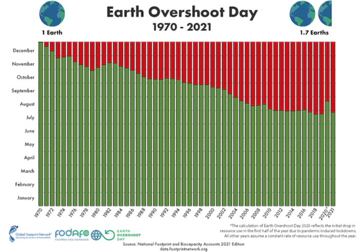 Depuis 2014, le Sauvage vous signale chaque année la date du jour du dépassement des ressources de la planète (http://www.lesauvage.org/2014/08/overshoot/). C’est l’Earth Overshoot Day calculé par le Global Footprint Network, cette institution d’origine universitaire à l’origine de la notion d’empreinte écologique. Cette année le jour du dépassement est le 29 juillet, presque un mois plus tôt qu’en 2020.