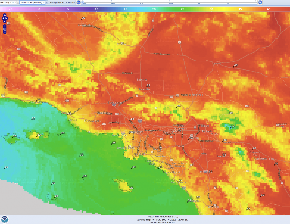 La température maximale hier le 3 septembre 2022 à Los Angelès, entre 38 et 43 degrés Celsius. Cliquez pour voir la carte en grand.