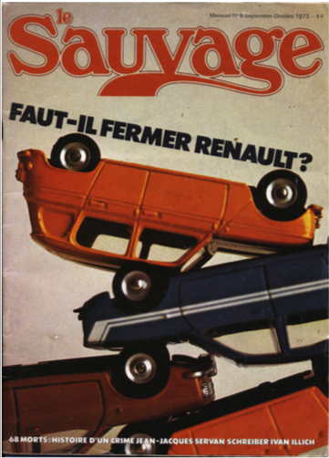 Les écologistes ne cessent de mettre en garde contre les méfaits de la pollution de l’air, mais aussi contre le “tout-automobile”, qui détruit les paysages et les vieux quartiers, qui paralyse les centres urbains. Alain Hervé, rédacteur en chef du Sauvage, va titrer ce sixième numéro “Faut-il fermer Renault ? “, un titre provocateur qui va attirer de nouveaux lecteurs vers le Sauvage. Au delà de la dénonciation de la pollution, ce numéro porte l’attention sur l’emprise mentale de la bagnole, sur les conséquences politiques et sociales de la l’automobilisation du monde.