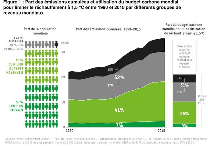 Commentaire : Le noir ce sont les 1% les plus riches (revenu supérieur à 7783 €/mois) le gris les 10 % (revenu supérieur à 2713 €/mois, je suis dedans !). Le vert foncé c’est tout simplement la moitié de la population mondiale. Si on doublait leur consommation carbone, on serait encore en dessous de ce que dépensent les 1 % les plus riches. G.N.