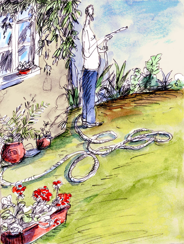 Soudain tout s’arrêta, le jet de gicler, le temps de filer, la rhubarbe de pousser, les pies de jacasser, seul un nuage flottait sans conviction.