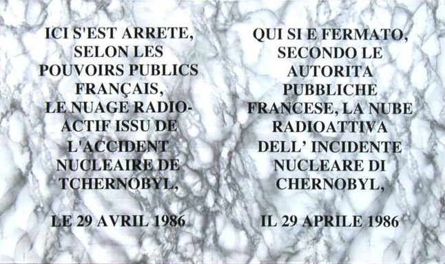 Plaque apposée à la frontière franco-italienne le 29 avril 2006, pour le 20e anniversaire de l’arrivée du nuage. Cette plaque est restée plus d’un an au milieu du pont qui sépare les deux pays près de Menton.