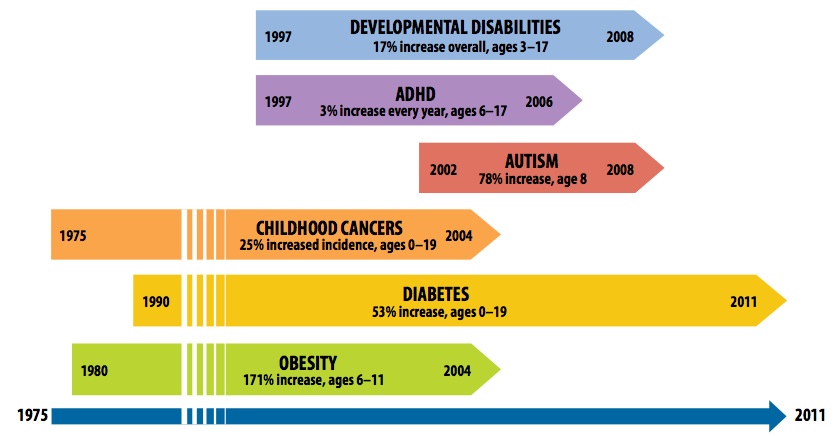 Fig. 1. Augmentation pendant la période 1975-2011 des troubles du développement, de l’hyperactivité avec perte d’attention, de l’autisme, des cancers de l’enfant, du diabète, de l’obésité