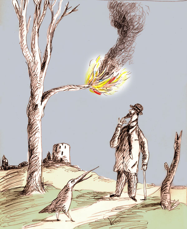 Il n’était pas rare, lors de ses promenades crépusculaires, que Georges soit le témoin de manifestations et de rencontres insolites: carbonisations spontanées, feux folâtres, ex-président du FMI surgissant d’un buisson, corbeau anarchiste de droite, SMS hallucinogènes et autres pluies de batraciens. Était-il l’agent inconsciemment provocateur de phénomènes de synchronicité (Jung) ou victime d’un complot ourdi par des officines cagoulardes pour empêcher les révélations explosives de la « Vie Brève »? La question se pose!